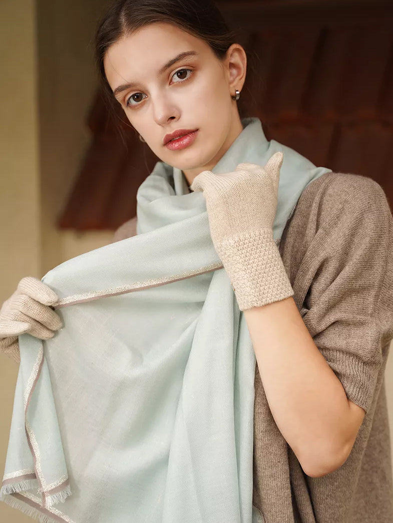 The scarf is made of pure wool in a 200 S yarn count. The higher the yarn count, the finer the yarn, and the thinner the cloth, the softer and more comfortable it is.